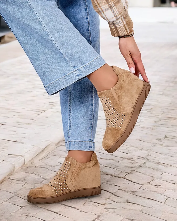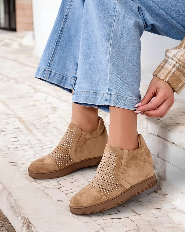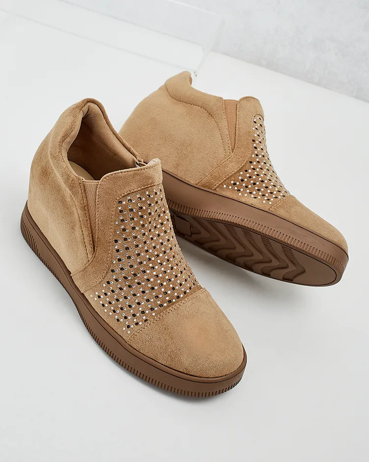 - Chaussures de sport pour femme à la mode sur ancre cachée, en éco-suède. Semelle intérieure en éco-cuir souple. Chaussures à enfiler, décorées de zircons. Elles seront une excellente décoration pour le style de tous les jours.