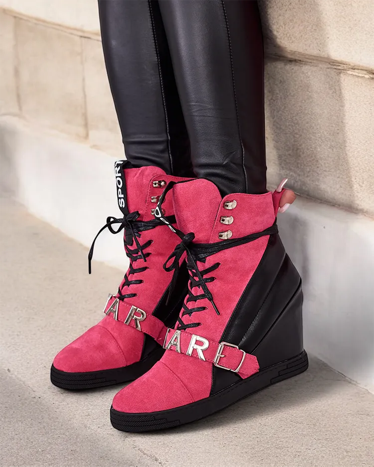 - Bottines sportives à talons pour femmes, composées d'une combinaison d'éco-cuir et d'éco-suède. Chaussures à lacets avec décorations sur la tige, semelle intérieure en tissu.