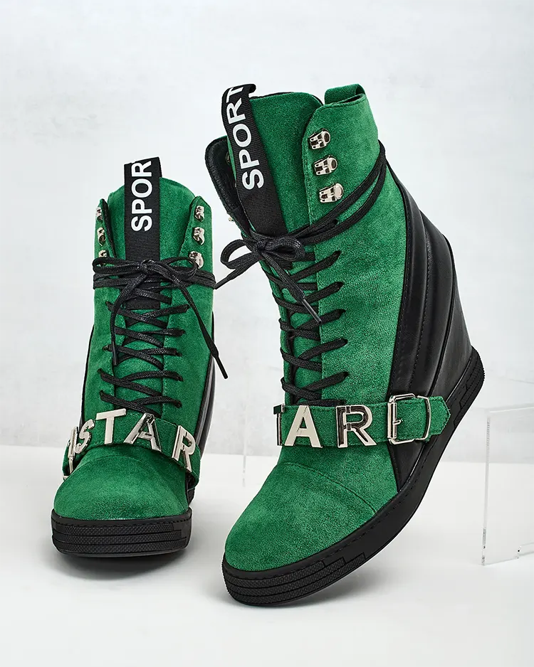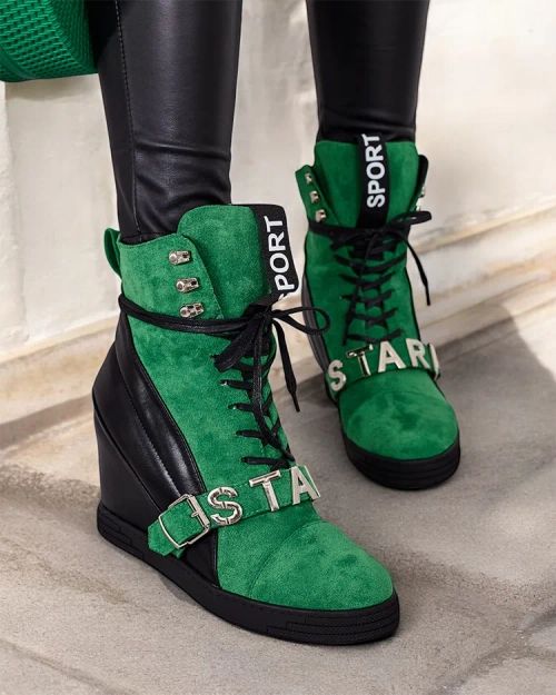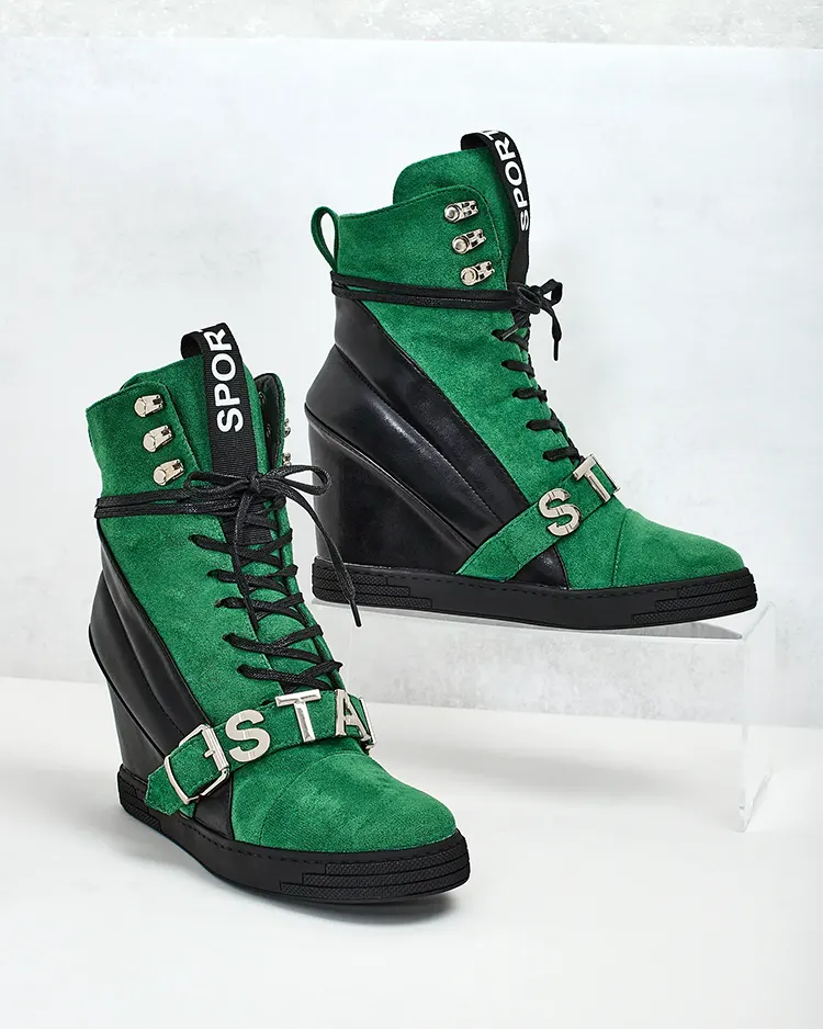 - Bottines sportives à talons pour femmes, composées d'une combinaison d'éco-cuir et d'éco-suède. Chaussures à lacets avec décorations sur la tige, semelle intérieure en tissu.