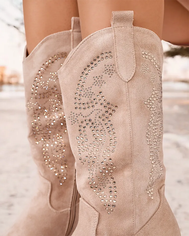 - Bottes a'la cowboy à talon bas, en cuir velours biologique décoré de zircons. L'intérieur est doublé de fourrure douce, bottes avec une fermeture à glissière jusqu'au milieu du mollet. Elles s'adaptent à de nombreux styles féminins !