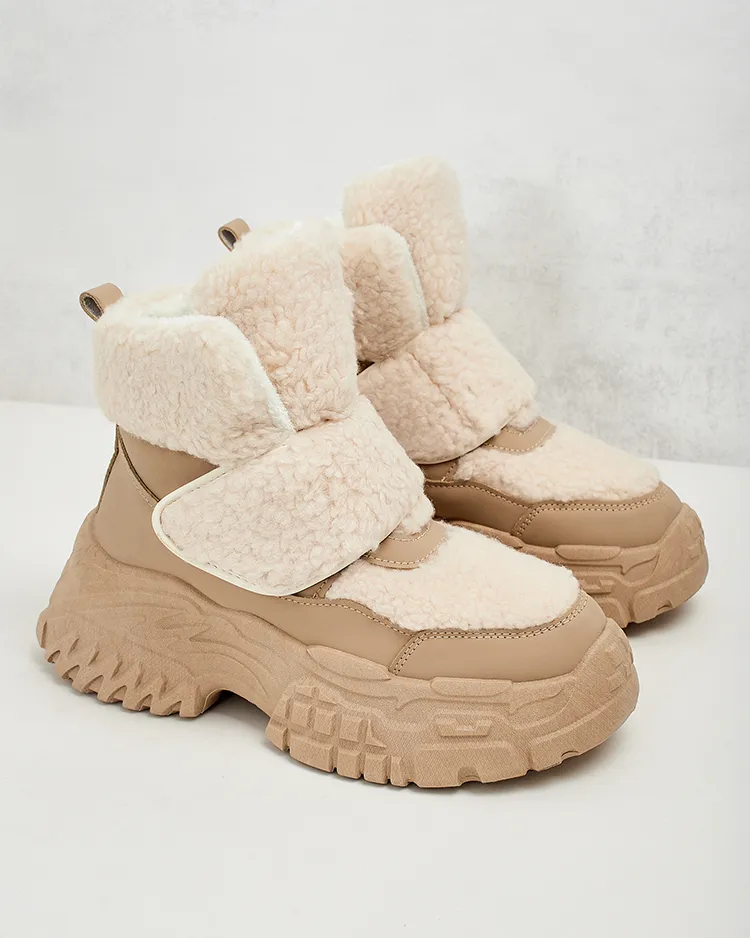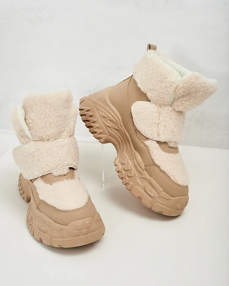 - Bottes de neige intemporelles pour femme. La tige est en cuir écologique avec des inserts en peau de mouton. Isolation sous forme de fourrure à l'intérieur, les chaussures ont une fermeture velcro. Idéales pour la saison froide !