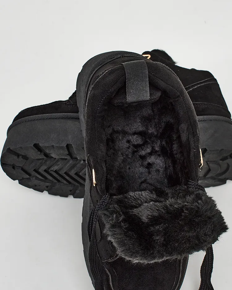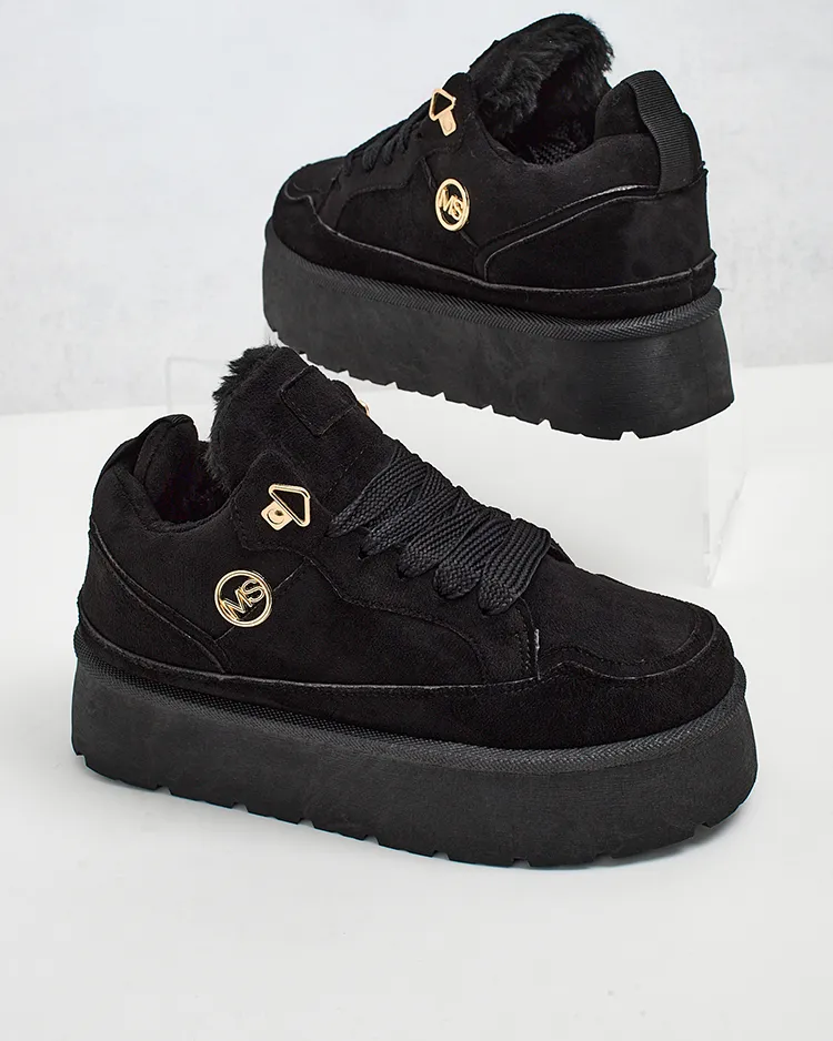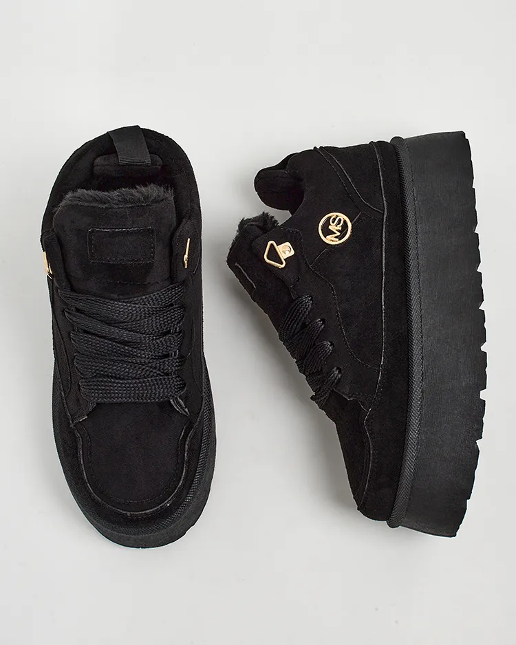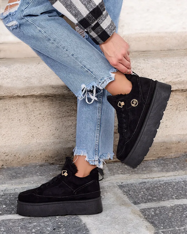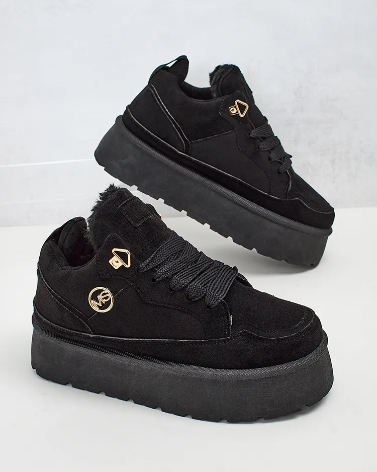 • Baskets compensées sportives pour femme. Dessus lacé, en cuir écologique. Intérieur entièrement isolé avec de la fourrure. Parfaites pour les tenues sportives !