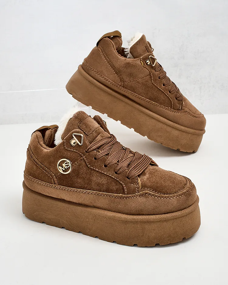 - Baskets compensées sportives pour femme. Dessus lacé, en cuir écologique. Intérieur entièrement isolé avec de la fourrure. Parfaites pour les tenues sportives !