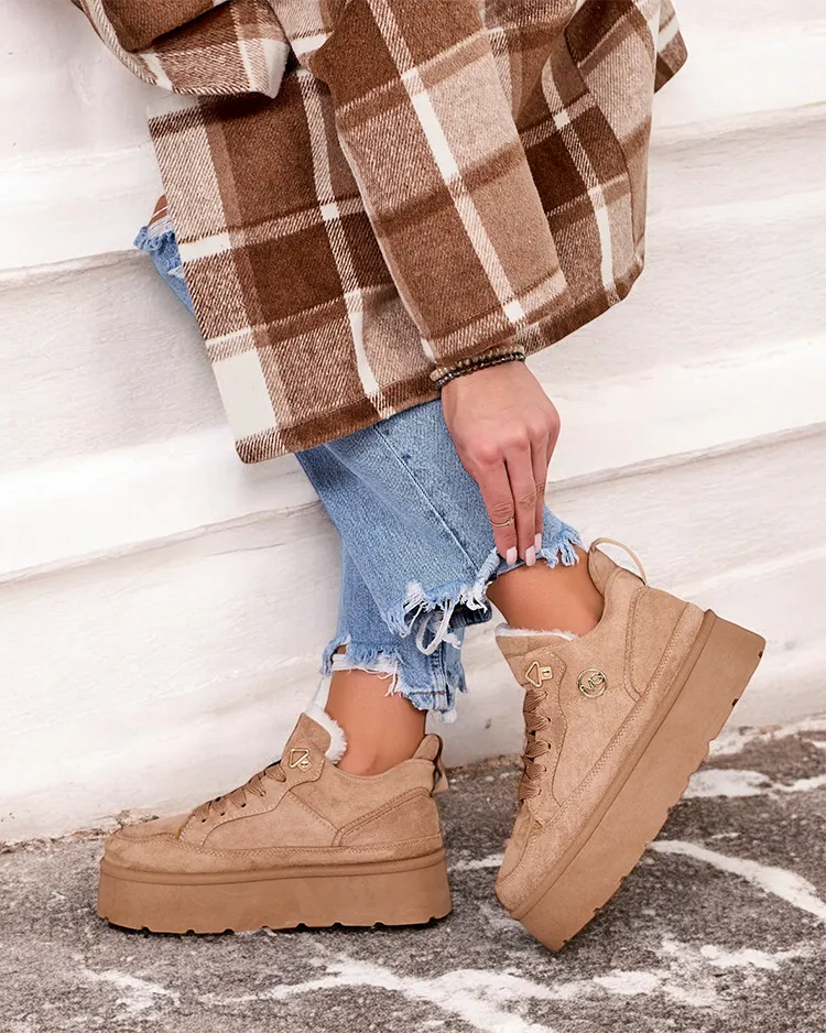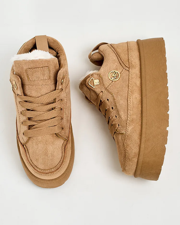 - Baskets compensées sportives pour femme. Dessus lacé, en cuir écologique. Intérieur entièrement isolé avec de la fourrure. Parfaites pour les tenues sportives !