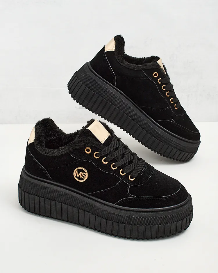 - Baskets sportives pour femme sur une semelle plus épaisse. Tige à lacets en nubuck écologique. Intérieur entièrement isolé avec de la fourrure. Idéales pour les jours plus froids !