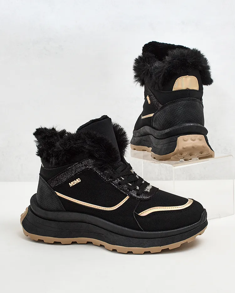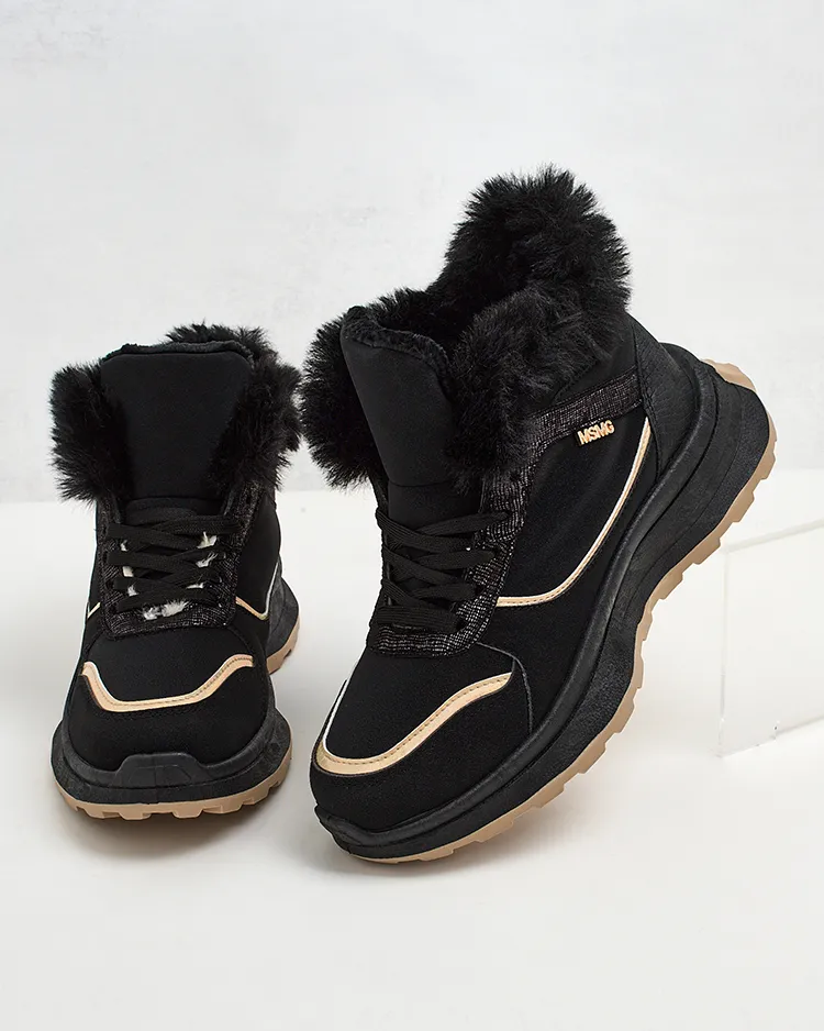 - Baskets de sport pour femme sur une semelle plus épaisse. Tige à lacets en nubuck écologique. Intérieur entièrement isolé avec de la fourrure. Parfaites pour les tenues sportives !