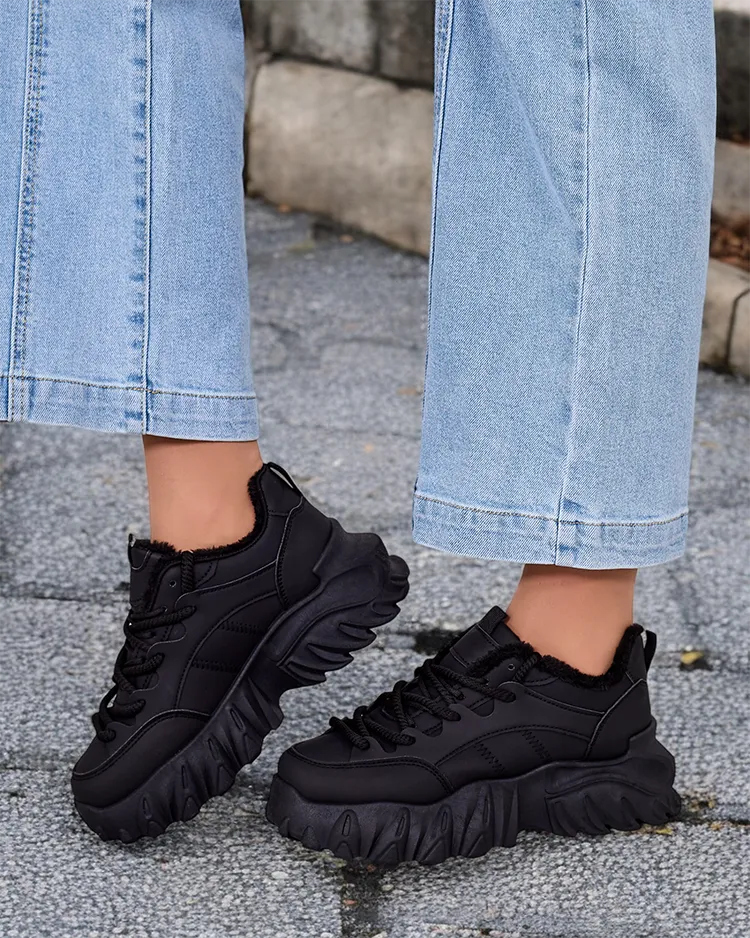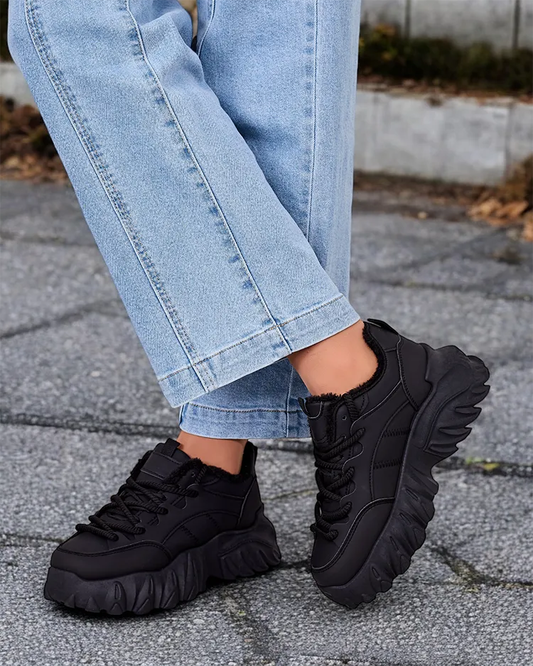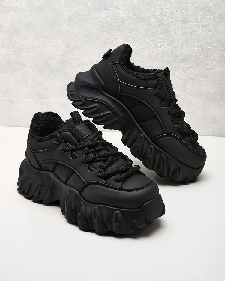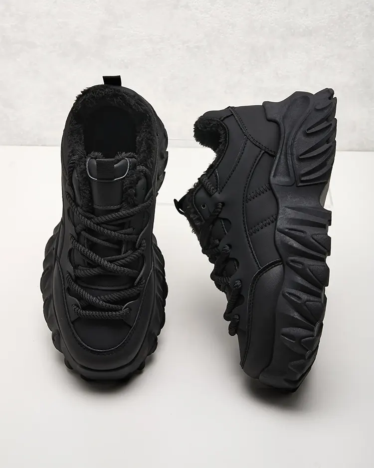 • Chaussures de sport isolées pour femmes, de type baskets, sur une semelle plus épaisse. Tige à lacets en cuir écologique mat. Intérieur en fourrure douce. Super complément à vos tenues décontractées d'hiver !