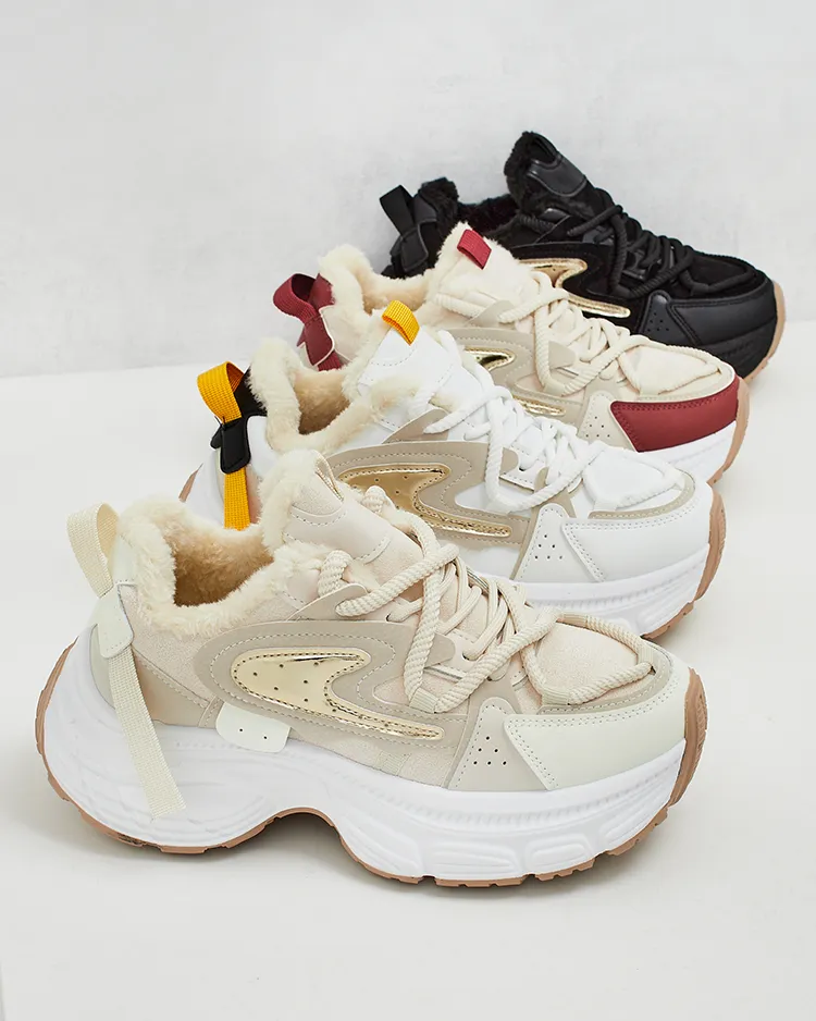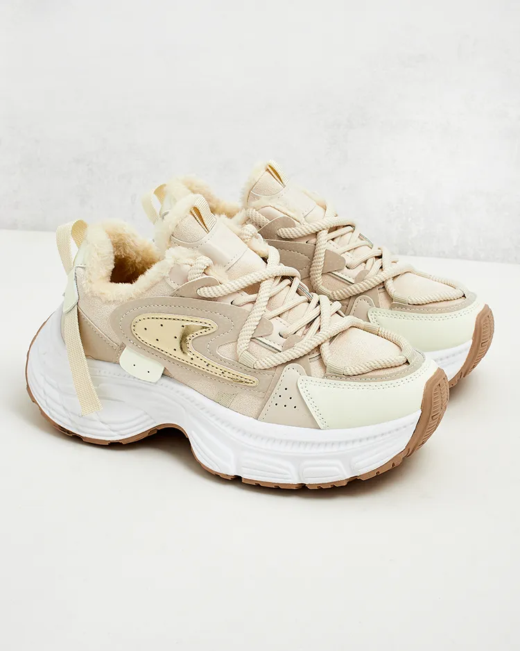 - Chaussures de sport isolées pour femme sur une semelle plus épaisse. Dessus lacé en cuir écologique suédé avec éléments en cuir écologique. Intérieur en fourrure douce. Superbe complément à vos tenues décontractées d'hiver !