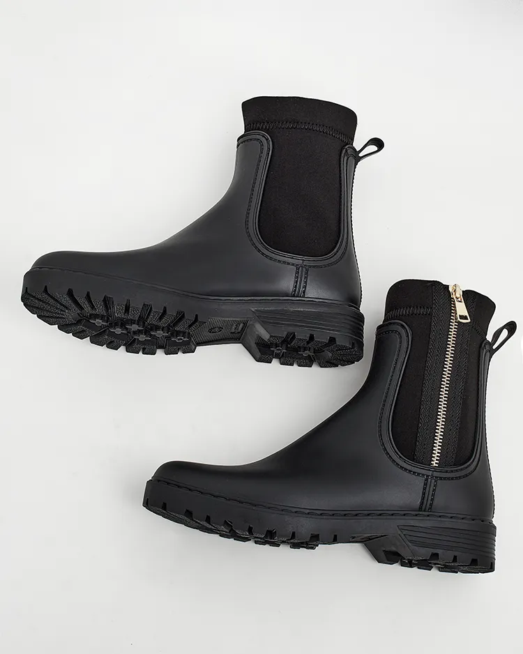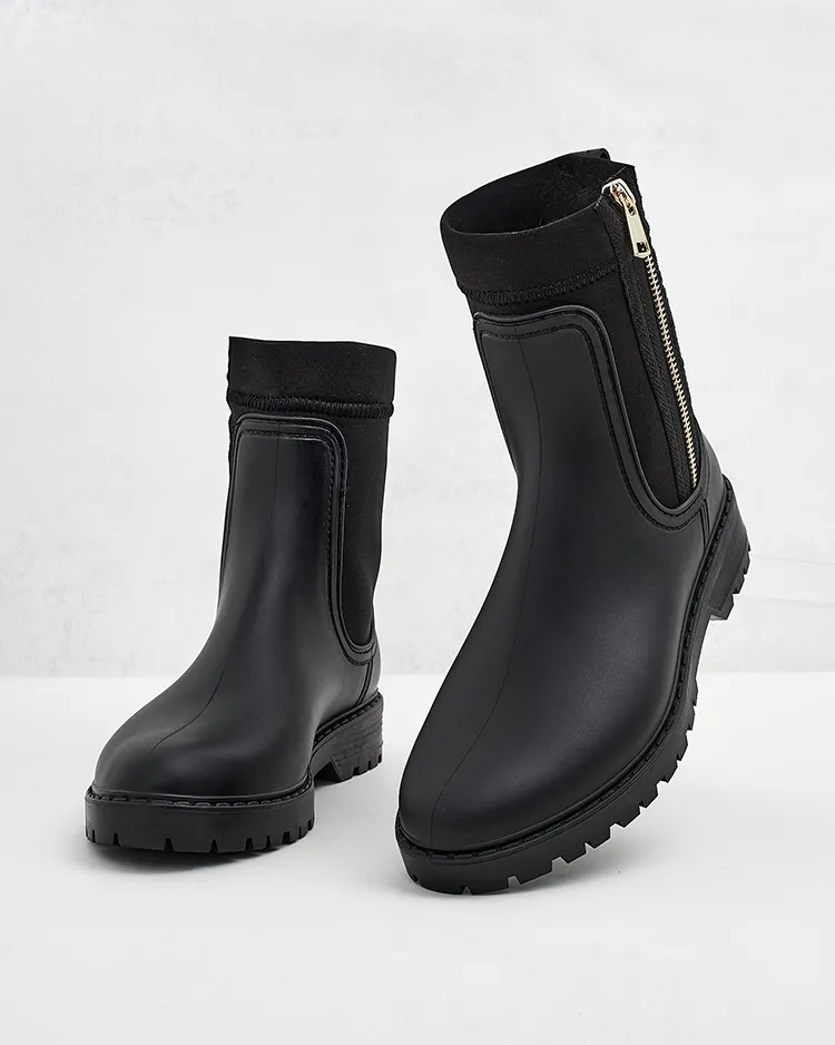 • Wellingtons classiques à talon plat pour femme en caoutchouc. La semelle intérieure est en tissu. Fermeture éclair décorative. Idéales pour les jours de pluie en automne !