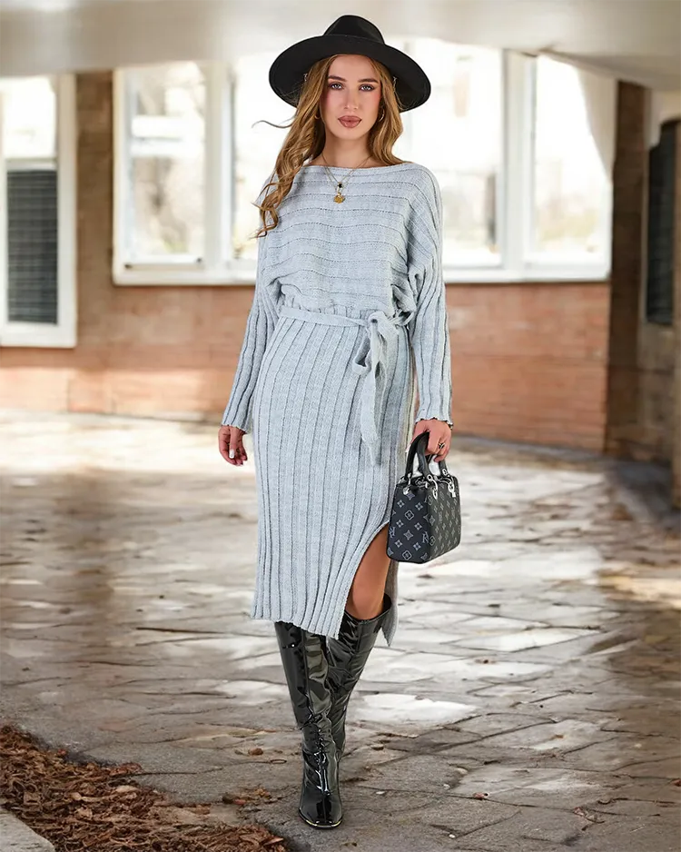 - Robe pull midi pour femme à manches longues et encolure ronde. De plus, une ceinture à la taille. Incontournable de cette saison ! NOTE : Précision des mesures (+/-) 1 cm. Dimensions mesurées à plat.