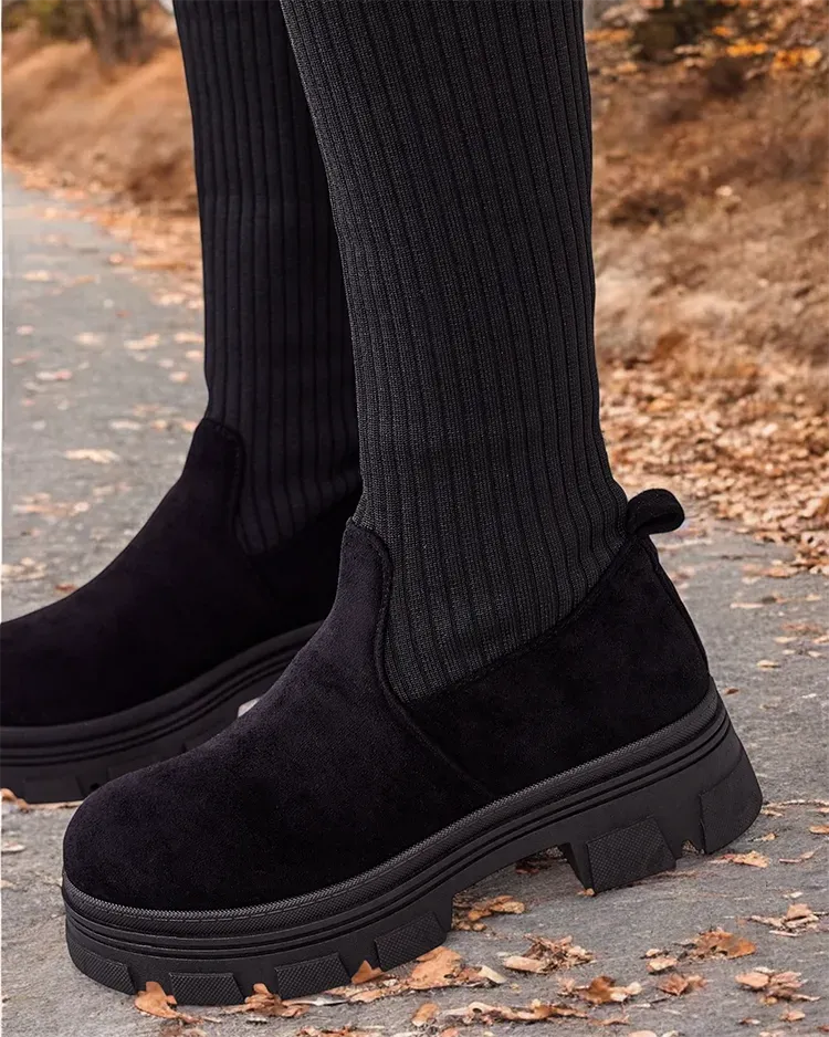 - Bottes élégantes à talon plat pour femme. La tige est en tissu élastique combiné à du daim écologique, semelle intérieure en fourrure. Modèle à enfiler. Parfaites pour les tenues d'automne de tous les jours !