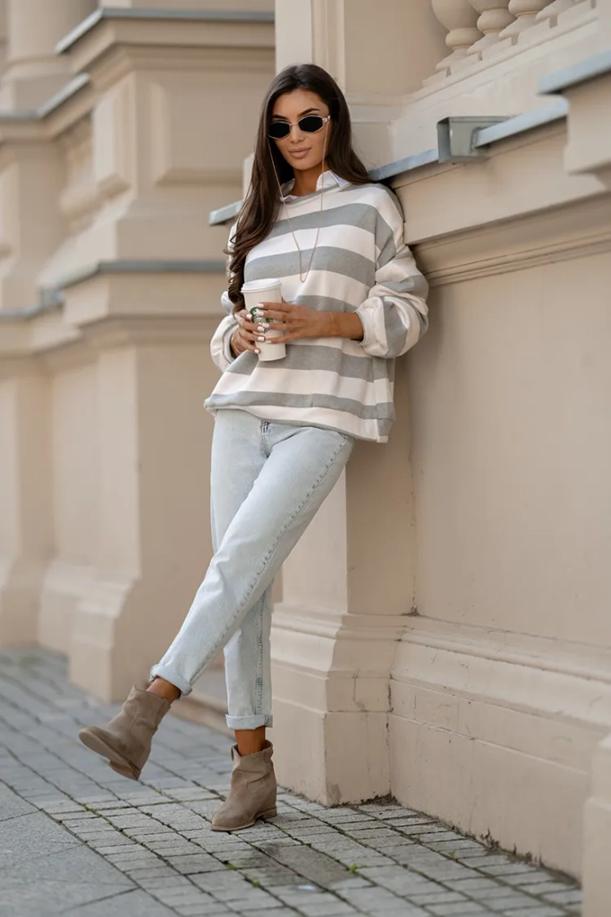 • Pull pour femme à encolure ronde en tissu agréable à motif rayé. Le modèle a des manches longues. Une base parfaite pour les tenues d'hiver !