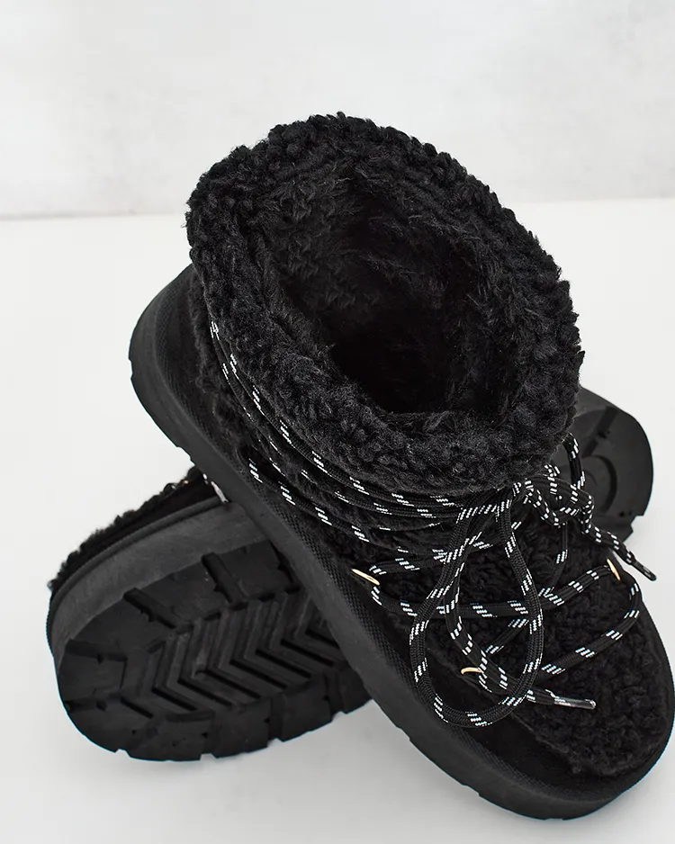• Bottes de neige pour femme dont la tige est composée d'une combinaison de cuir éco-daim et de peau de mouton a' la. Doublées de fourrure à l'intérieur, chaussures à enfiler et à lacets. Parfaites pour l'hiver !