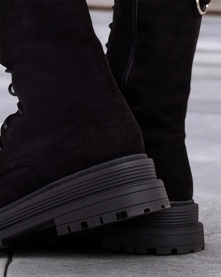 - Bottes élégantes pour femmes en cuir éco-daim. Les bottes sont lacées et zippées. Le modèle a une semelle plate et un rembourrage en fourrure. Parfaites pour l'automne !