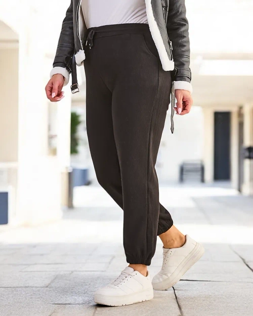 • Pantalons de jogging intemporels pour femmes, fabriqués dans un matériau souple et côtelé. Un modèle à la coupe simple, avec deux poches latérales et une taille élastique avec des cordons de serrage. Un choix idéal pour le quotidien!