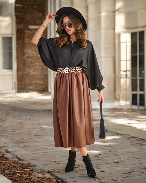 - Jupe midi élégante pour femmes, faite de simili-cuir, avec une taille élastique et une ceinture décorative. Une jupe évasée. Un incontournable dans la garde-robe de chaque femme!