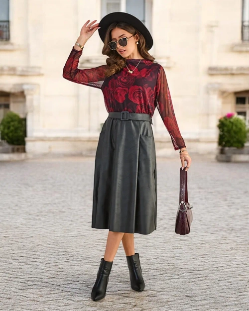 - Jupe midi pour femme en matériau simili cuir. Le modèle a une taille élastique et 2 poches. Base idéale pour de nombreux looks uniques ! Le modèle est livré avec une ceinture. ATTENTION : Précision des mesures (+/-) 1 cm.