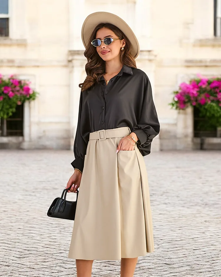 • Jupe midi pour femme en matériau simili cuir. Le modèle a une taille élastique et 2 poches. Base idéale pour de nombreux looks uniques ! Le modèle est livré avec une ceinture. ATTENTION : Précision des mesures (+/-) 1 cm.