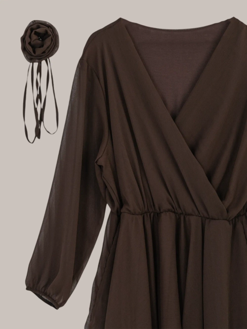 - Élégante et intemporelle, cette robe pour femme de longueur genou possède un décolleté cache-cœur et une taille élastique. La robe est dotée de manches longues en maille et d'une ceinture décorative supplémentaire avec une fleur. Un excellent choix pour u