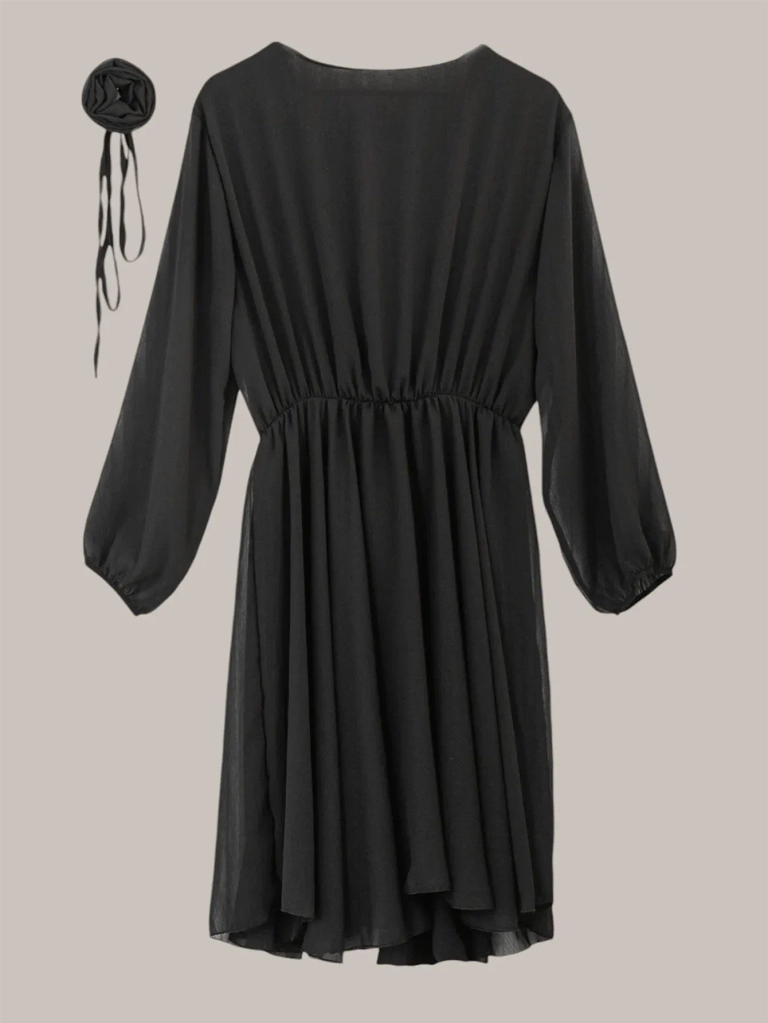 • Élégante et intemporelle, cette robe mi-longue pour femme présente un décolleté croisé et une taille élastique. La robe a des manches longues en résille et un nœud décoratif supplémentaire avec une fleur. Un excellent choix pour le soir !