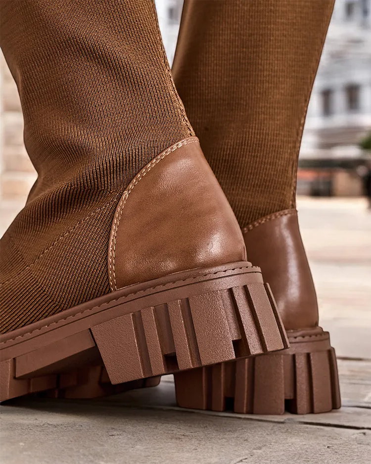 - Bottes au-dessus du genou élégantes pour femmes sur une semelle plus épaisse. L'empeigne est en tissu flexible avec des inserts en éco cuir, semelle intérieure en tissu. Modèle slip-on. Parfait pour les tenues d'automne de tous les jours !