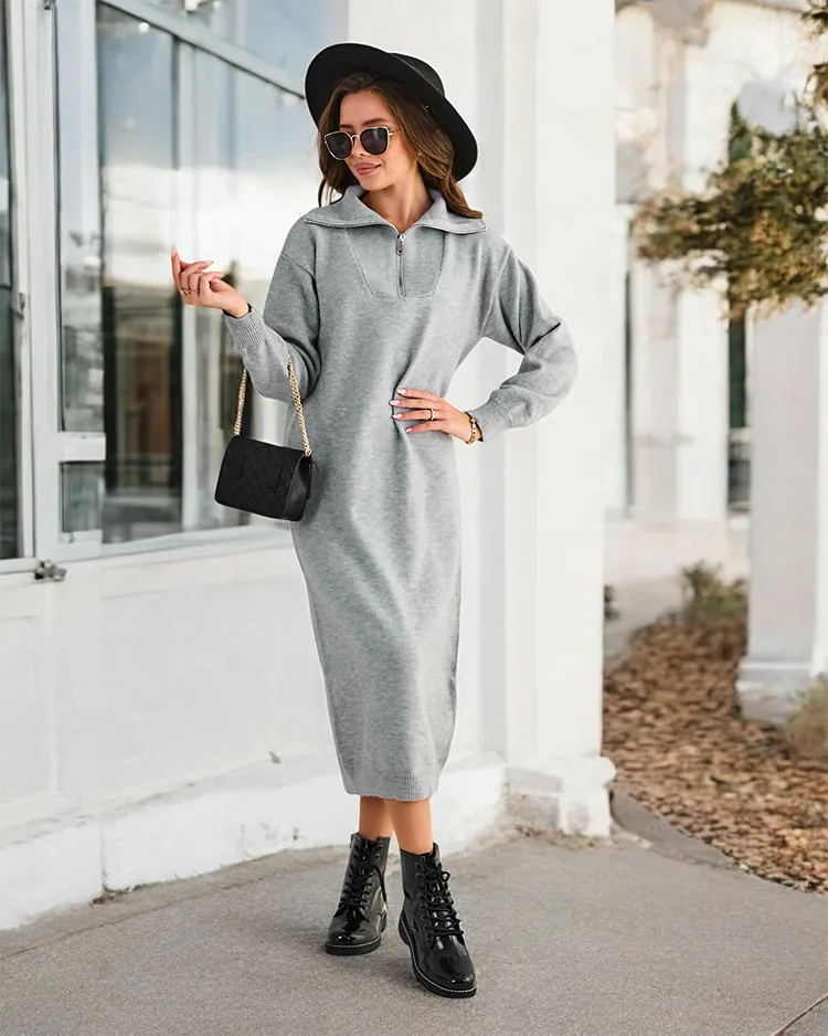 - Robe-pull midi femme avec manches longues. Le modèle est en tricot. Col zippé. Indispensable cette saison! REMARQUE: Précision des mesures (+/-) 1 cm. Mesures prises à plat.