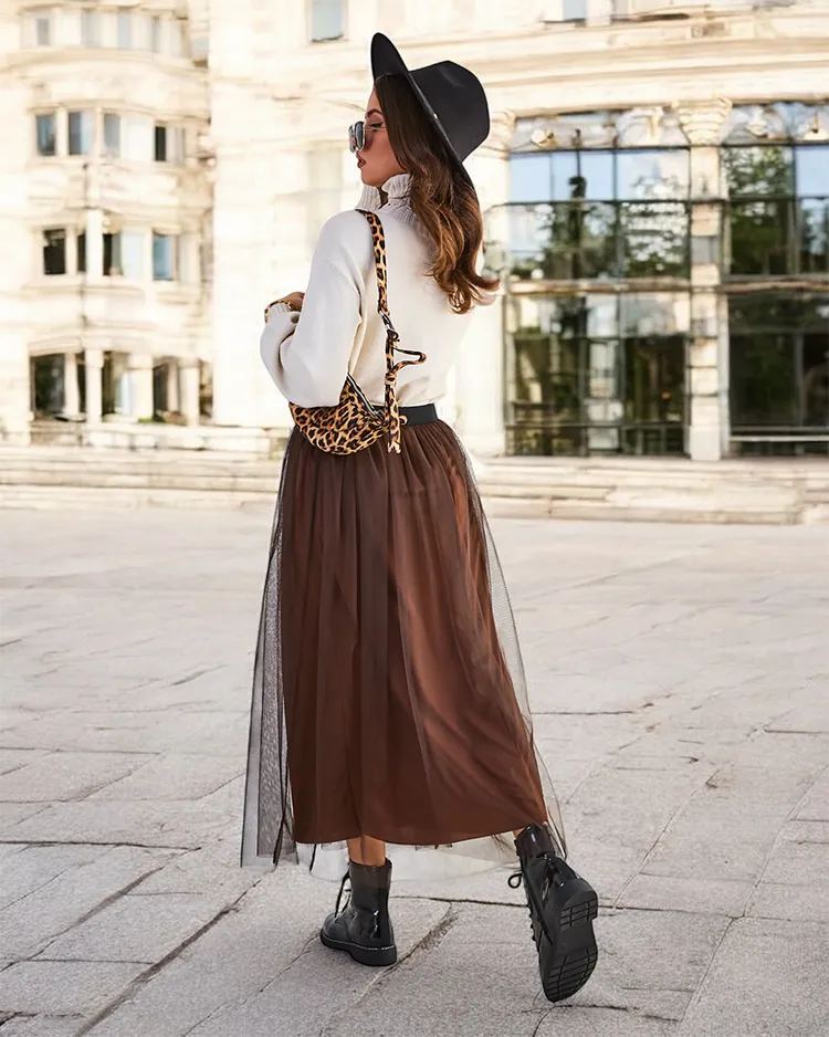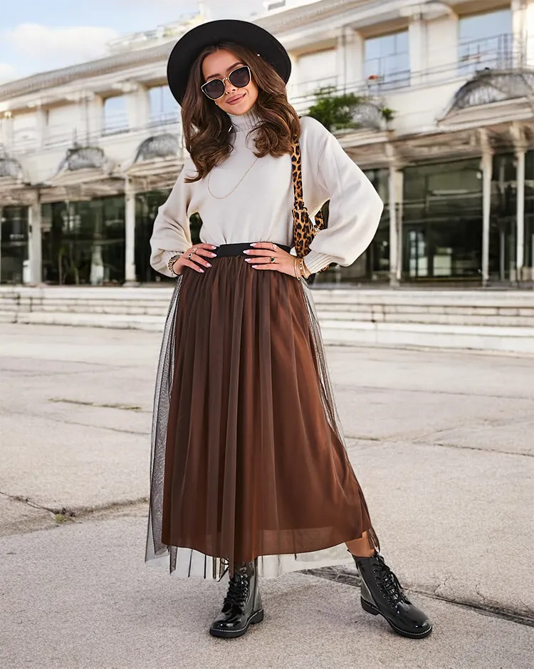 - Une jupe midi en tulle pour femme fabriquée dans un tissu léger. Modèle avec doublure, taille élastique. La jupe sera parfaite pour l'automne ! REMARQUE : Précision de la mesure (+/-) 1 cm.