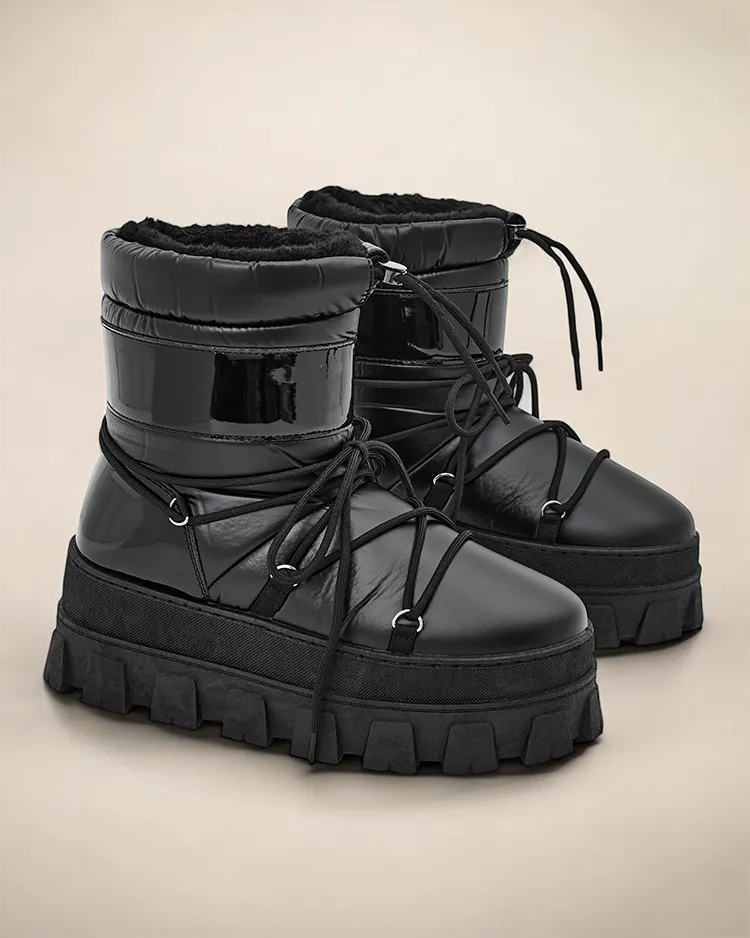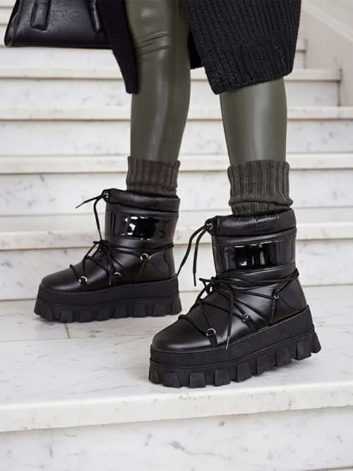 - Bottes de neige pour femmes avec dessus en tissu ressemblant à de la toile et en cuir verni. À l'intérieur, il y a une doublure en fourrure agréable, chaussures à enfiler et à lacets. Parfait pour l'hiver!