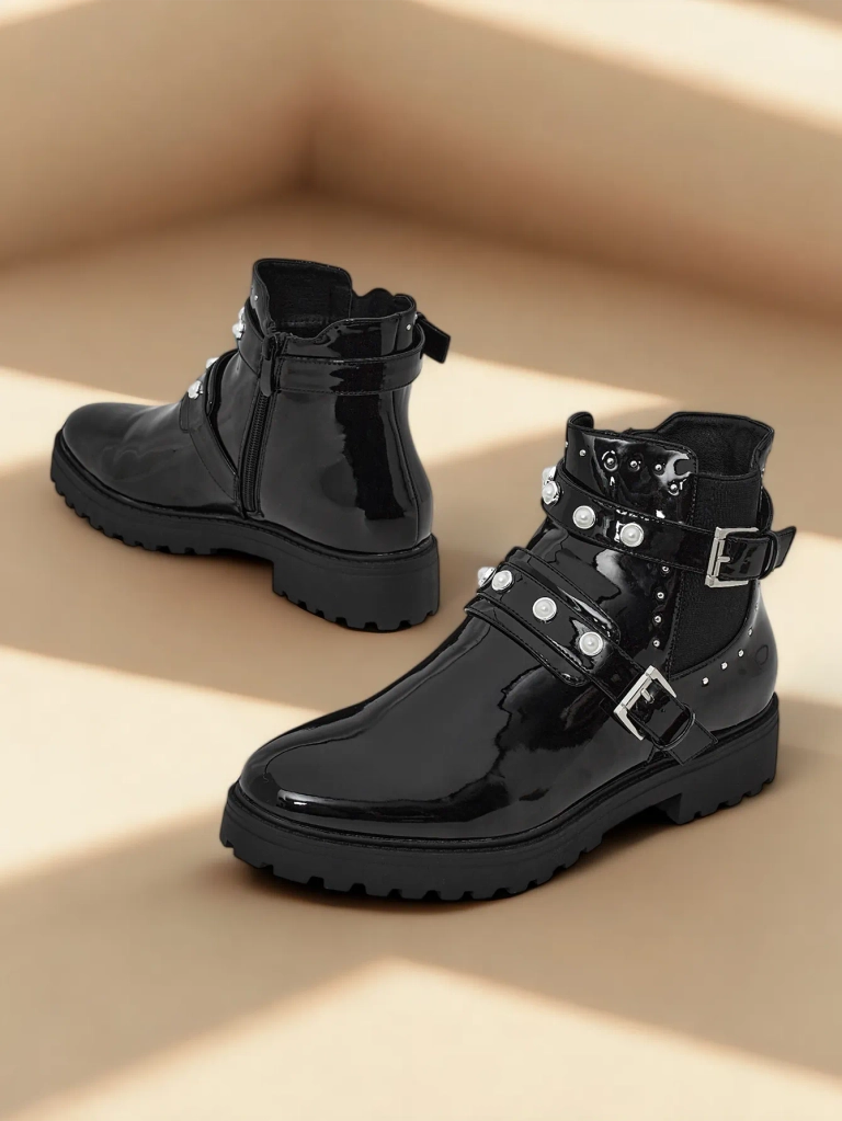 - Bottes élégantes en similicuir verni. Chaussures fermées par une fermeture éclair, dotées d'une semelle plus épaisse en caoutchouc et d'une doublure en fourrure délicate. Le modèle est décoré d'élégantes décorations sur le dessus. Portez-les pour un style