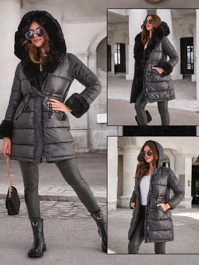 - Manteau d'hiver pour femme isolé avec capuche et doublure en fourrure amovible. Le modèle est fermé avec une fermeture éclair et des boutons, possède 2 poches et des cordons de serrage soulignant la taille. Parfait pour les journées plus froides!