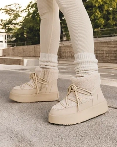 • Bottes de neige pour femmes avec une tige fabriquée à partir d'une combinaison de cuir écologique et de tissu agréable. À l'intérieur, il y a une doublure en fourrure agréable, les chaussures ont une fermeture éclair et une tige lacée. Parfait pour l'hive