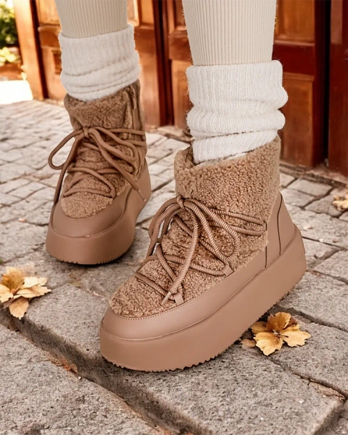 - sont des bottes de neige pour femmes avec une tige fabriquée à partir d'une combinaison d'éco-cuir et de tissu agréable. À l'intérieur, il y a une doublure en fourrure confortable, les bottes ont une fermeture éclair et une tige lacée. Parfaites pour l'hi