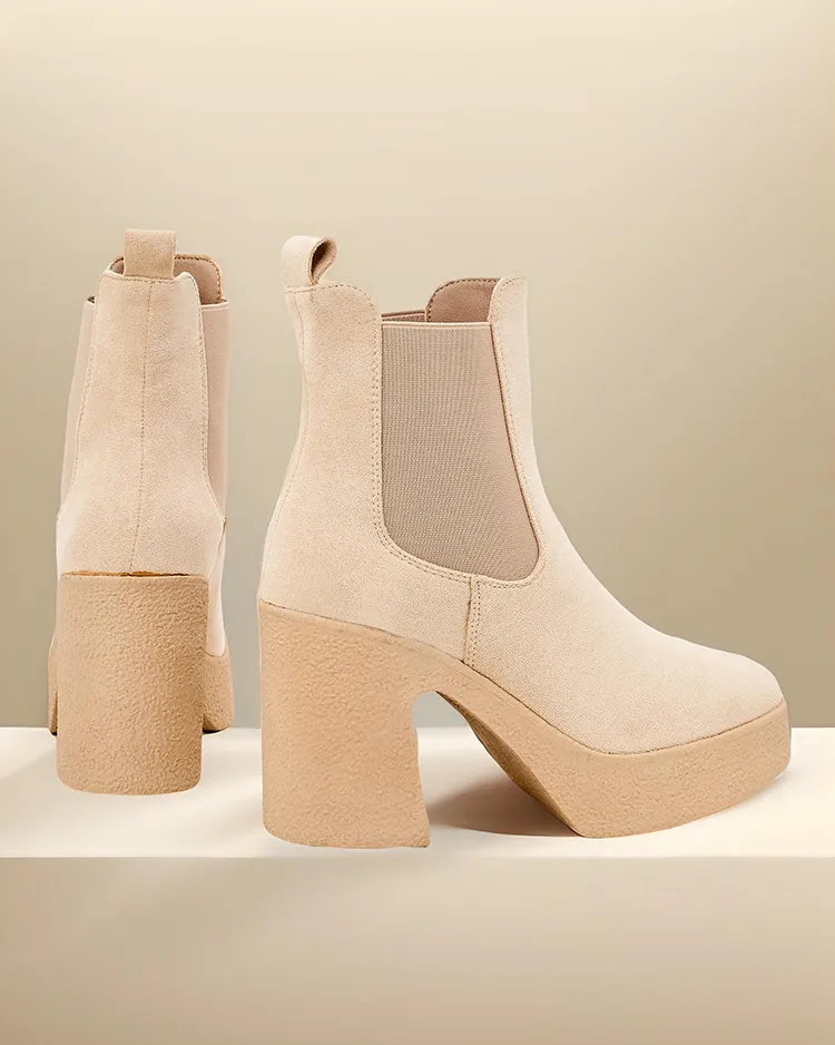 - Bottines uniques sur un talon et une plateforme - style et confort en un. Modèle à enfiler avec un bout rond. Chaussures en cuir suédé écologique. Doublure en doux fourrure à l'intérieur. Parfait pour les tenues d'automne!