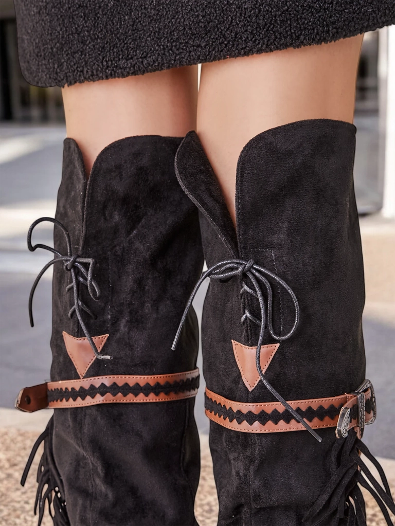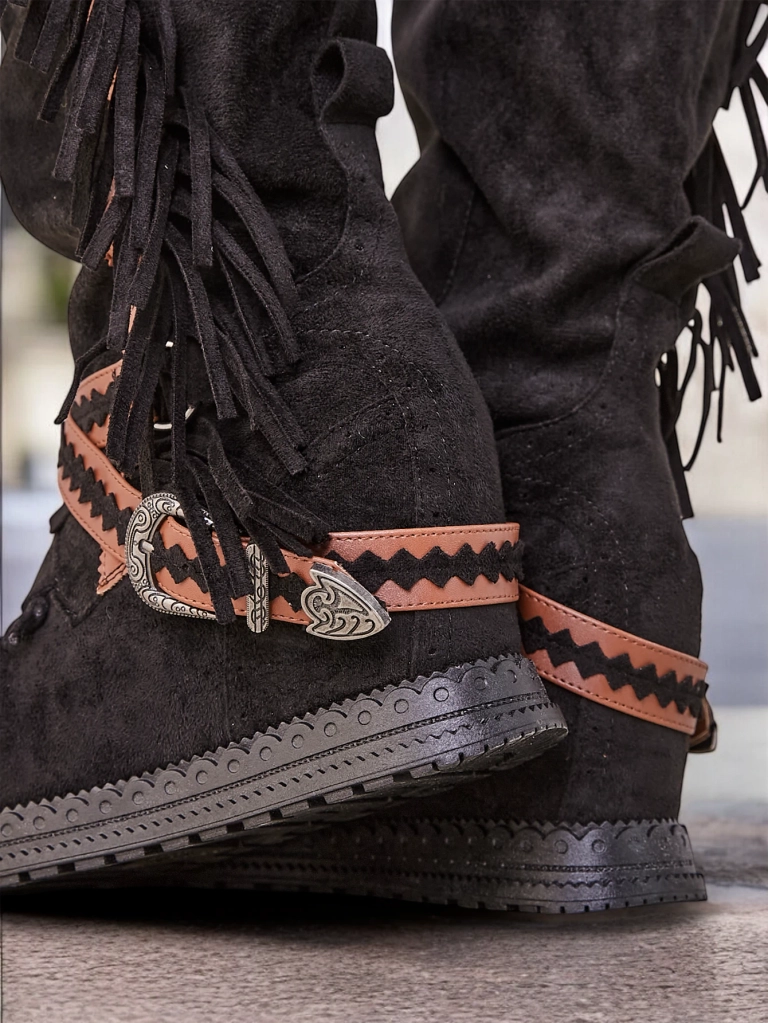 - Bottes cuissardes élégantes pour femmes avec un talon compensé caché. L'empeigne est en cuir éco-daim. Doublure en tissu. Modèle à enfiler, décoré de franges et de lanières estampées.