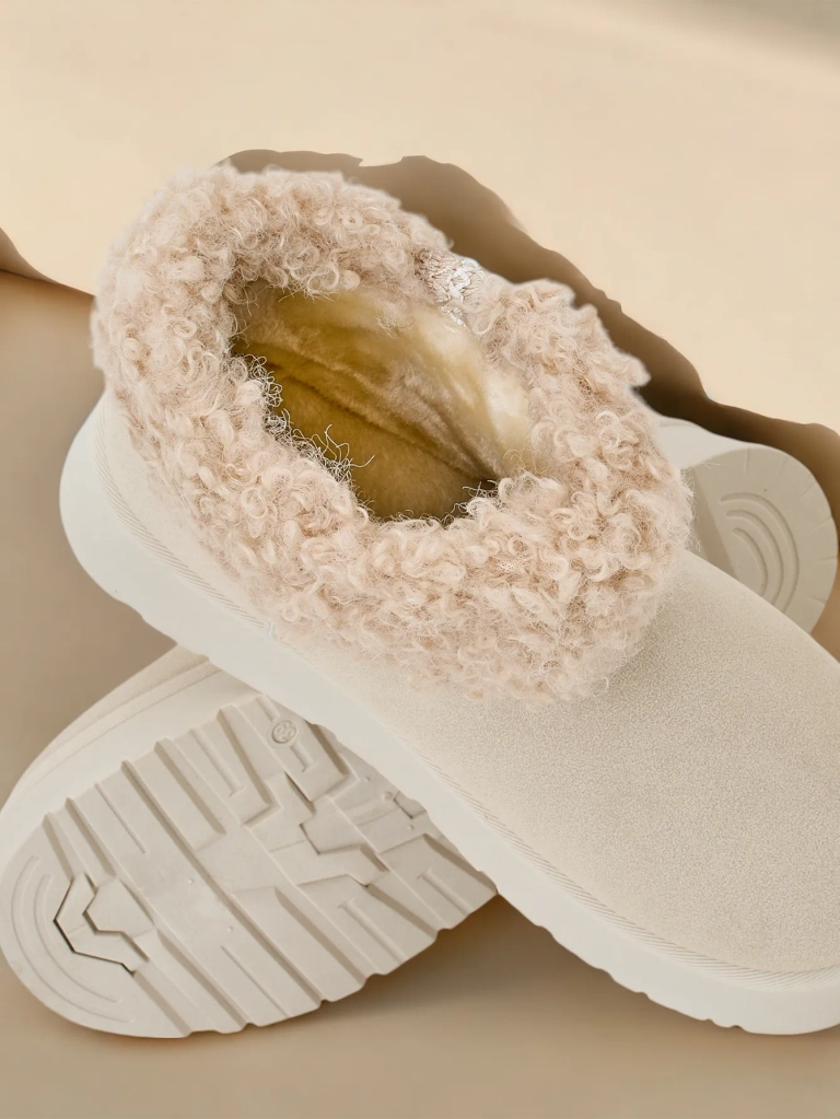 - Bottes de neige pour femmes avec une tige en simili daim et des inserts en fourrure en haut de la tige. À l'intérieur, il y a une doublure en fourrure, les chaussures ont une tige à enfiler. Parfait pour l'hiver!