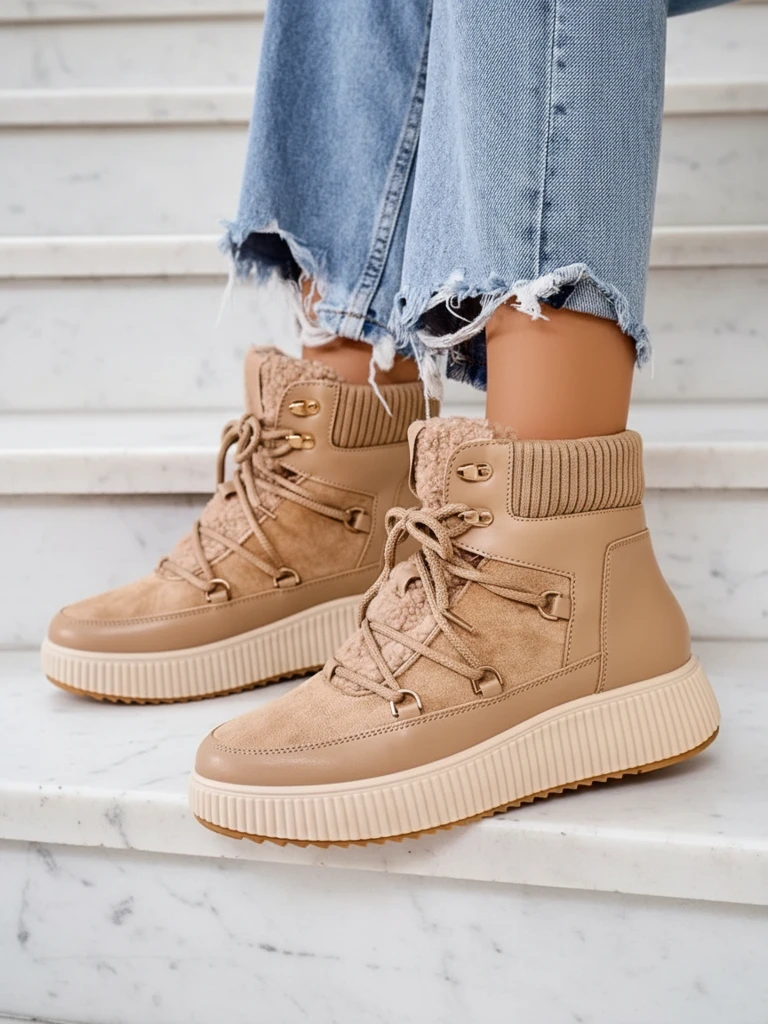 - Bottes de neige intemporelles pour femmes avec une semelle épaisse. Dessus en éco-cuir. À l'intérieur, doublé de fourrure, chaussures à lacets. Parfaites pour les saisons plus froides !