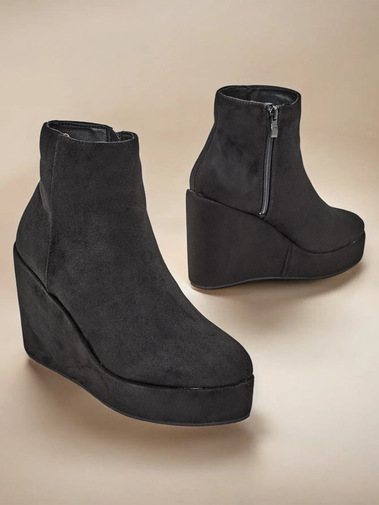 - Élégantes bottes compensées pour femmes, fabriquées en éco-daim. Les chaussures sont doublées à l'intérieur de fourrure. Choix parfait pour l'automne!
