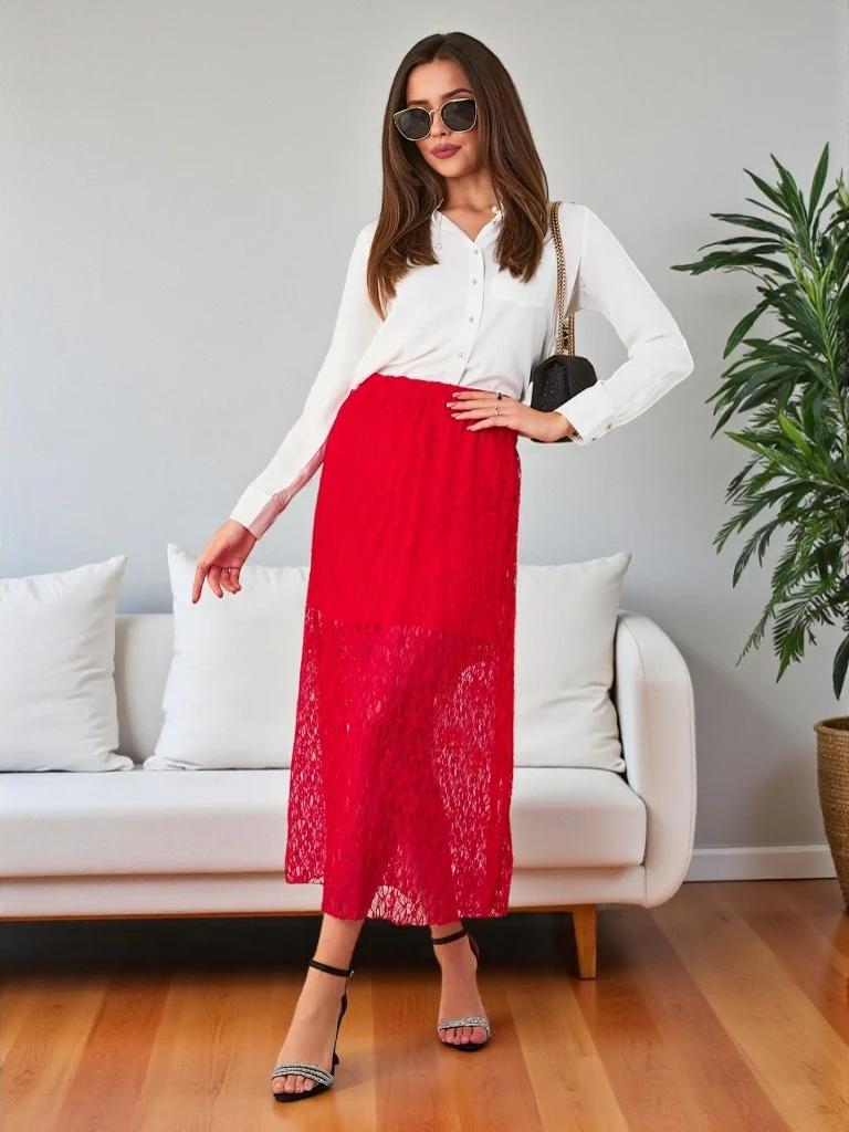 - Jupe midi pour femme en tissu léger. Modèle avec doublure et couche extérieure en dentelle, bande élastique à la taille. La jupe sera parfaite pour l'automne ! REMARQUE : Précision des mesures (+/-) 1 cm.