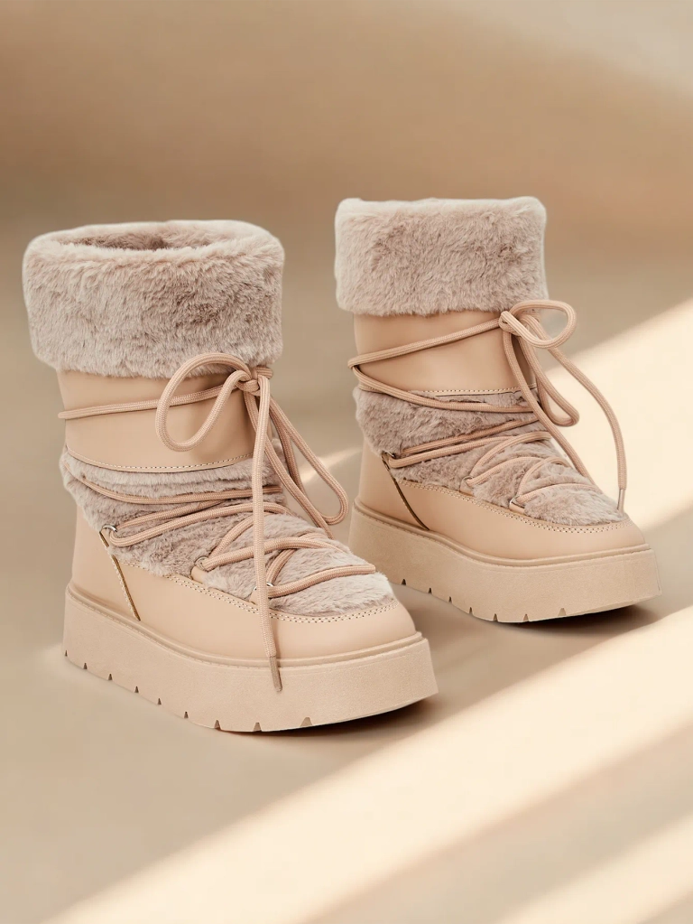 - Bottes de neige pour femmes avec une tige faite d'une combinaison d'éco-cuir et de tissu agréable. À l'intérieur, il y a une doublure en fourrure agréable, les chaussures ont une tige lacée. Parfait pour l'hiver !
