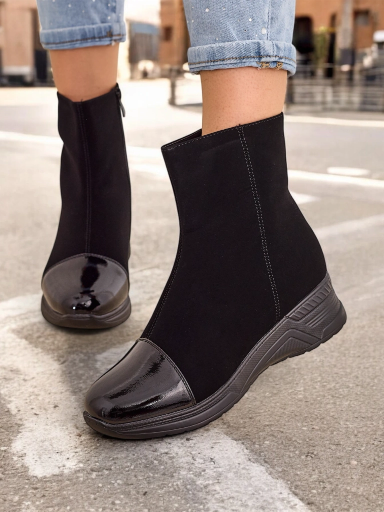 - Superbes bottes compensées pour femmes, faites de cuir éco mat avec un bout en vernis. L'intérieur est fait de fourrure agréable. Modèle fermé avec une fermeture éclair. Parfait pour les tenues d'automne!