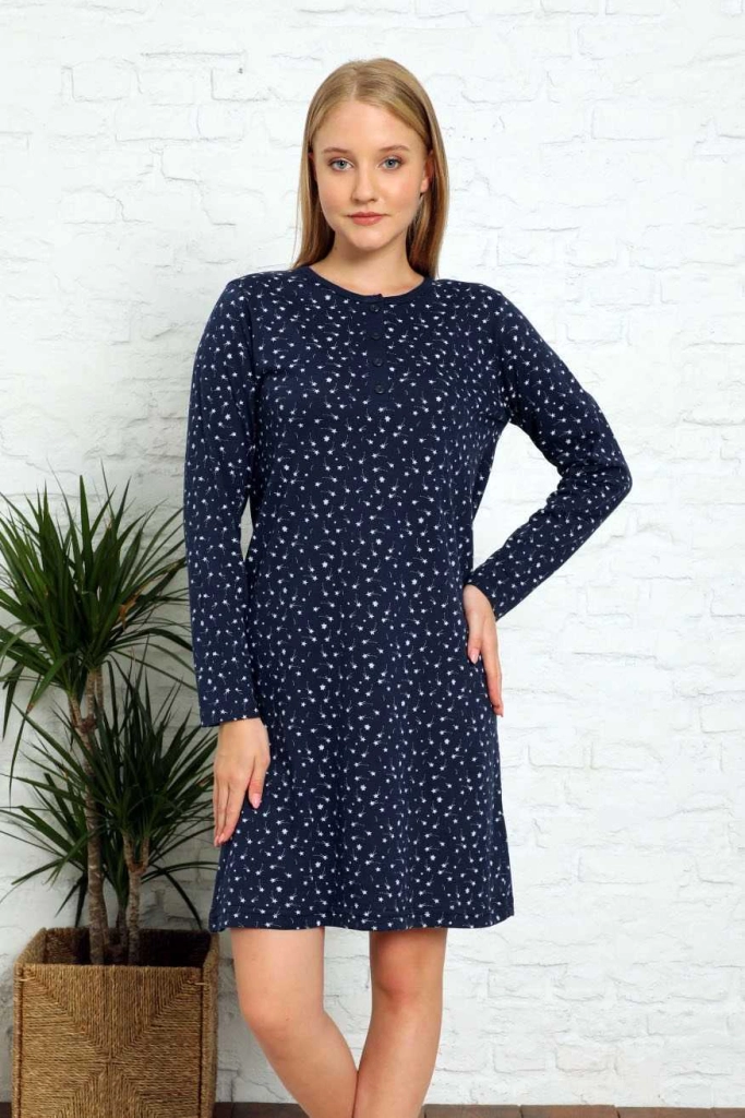 - Chemise de nuit pour femmes en 100 % coton doux. Le modèle a une coupe légèrement évasée. Elle possède un col rond, des manches longues et un imprimé décoratif. REMARQUE : Précision de la mesure (+/-) 1 cm.