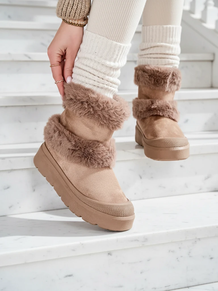 - Bottes de neige pour femmes avec une tige fabriquée en combinaison de cuir éco suède et de tissu confortable. À l'intérieur, il y a une doublure en fourrure agréable. Parfaites pour l'hiver !