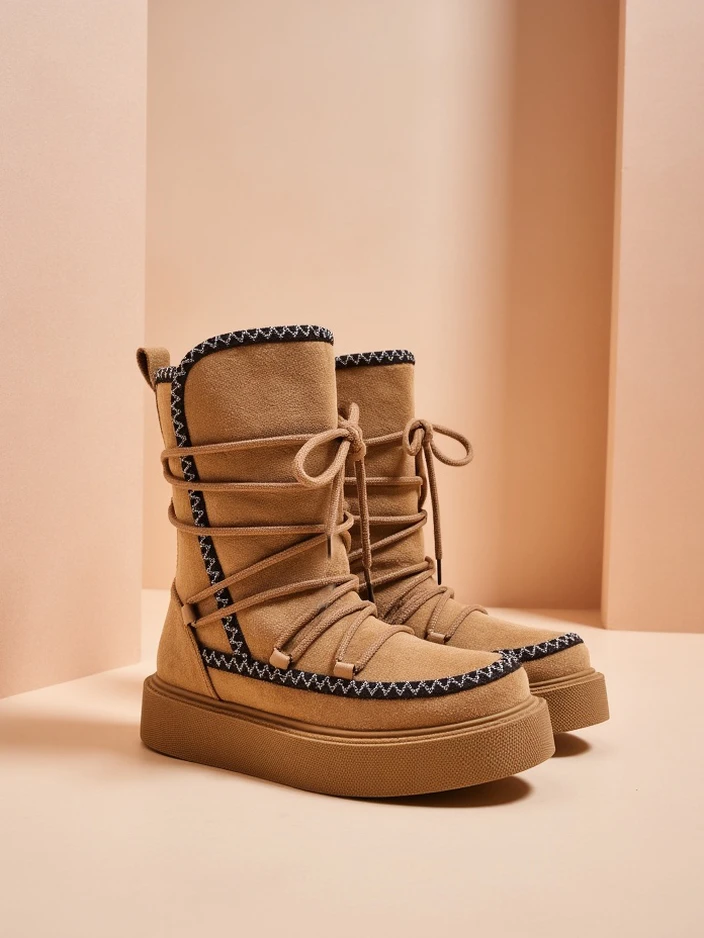 - Bottes de neige pour femmes avec une tige en cuir suédé éco. À l'intérieur, il y a une isolation délicate, et les chaussures sont lacées. Parfaites pour l'hiver !