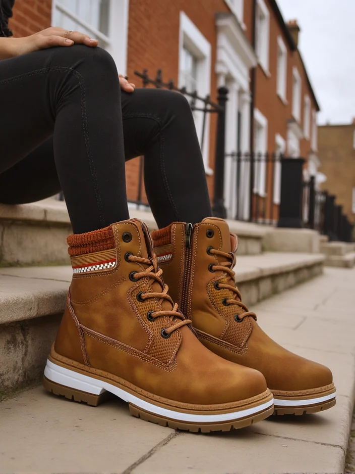 • Bottes de trekking pour femmes avec tige à lacets et fermeture éclair sur le côté. Le matériau est en simili cuir. L'intérieur des chaussures est doublé de fourrure. Parfait pour l'hiver !