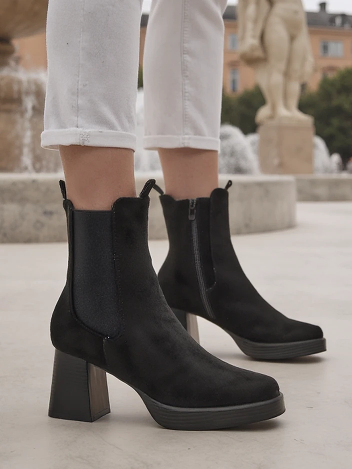 - Bottines élégantes en éco-suède - la solution parfaite pour les jours plus frais. Les chaussures sont dotées d'une fermeture éclair et présentent une semelle intérieure en cuir éco. Modèle avec un talon bloc décoratif et un bout carré.