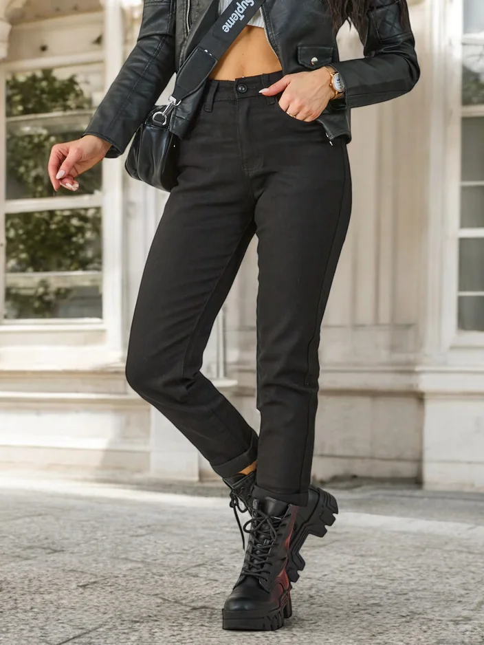 - Jean mom femme élégants en coton. Le modèle présente une taille haute, une fermeture à bouton et à zip, et 4 poches. Un incontournable dans chaque garde-robe !