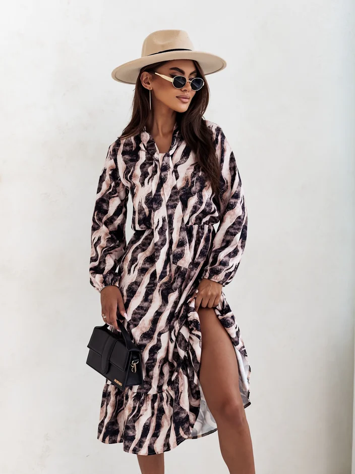 - Robe midi femme avec imprimé, manches longues et décolleté à nouer. Le modèle présente une taille élastique et une coupe fluide. Parfaite pour un usage quotidien ! REMARQUE : Précision des mesures (+/-) 1 cm.