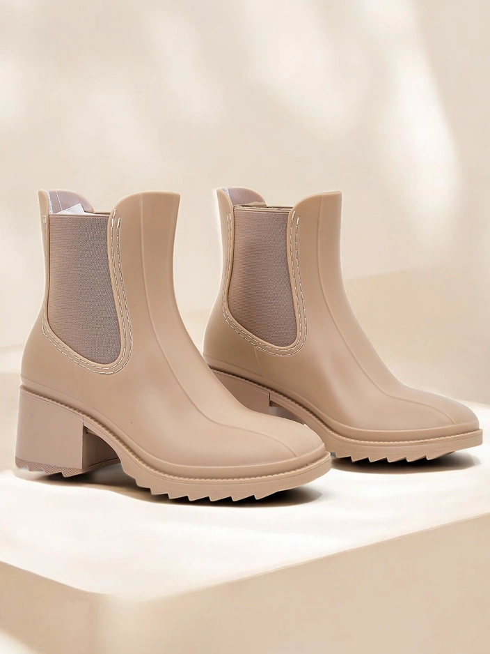 - Classiques, bottines pour femmes à enfiler avec un talon plat, faites en matériau en caoutchouc. À l'intérieur, il y a une semelle en tissu. Inserts élastiques sur les côtés. Parfaites pour les jours de pluie en automne !