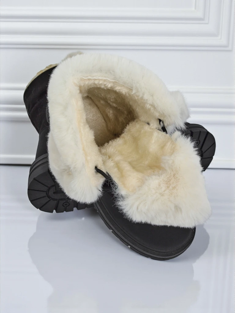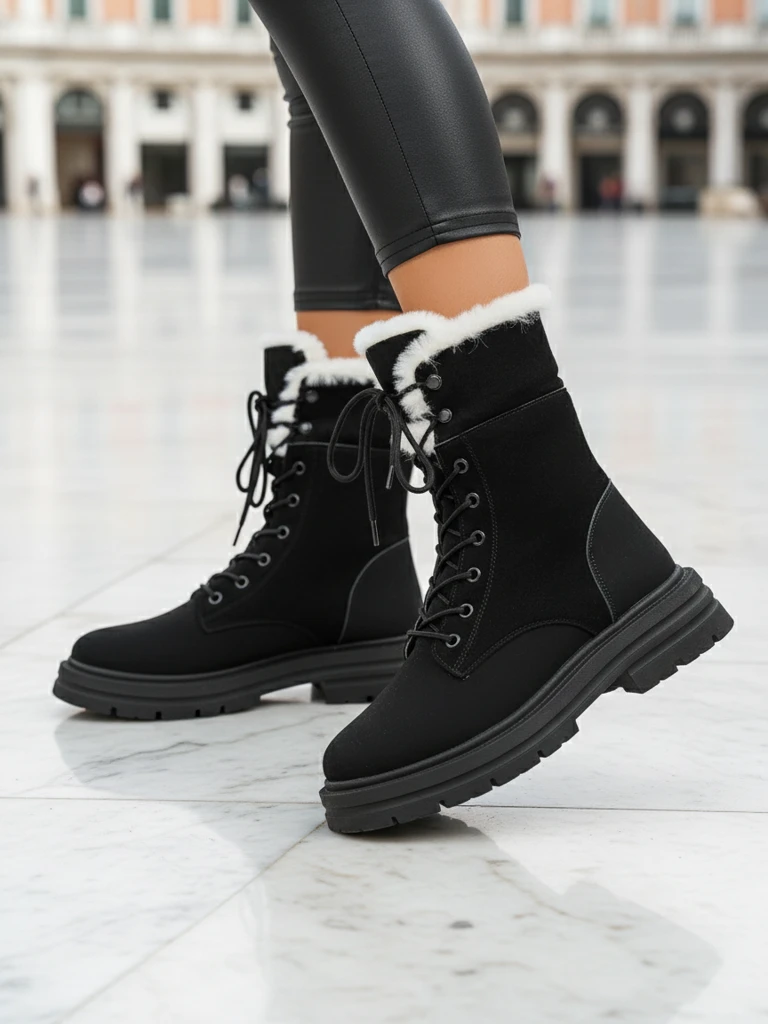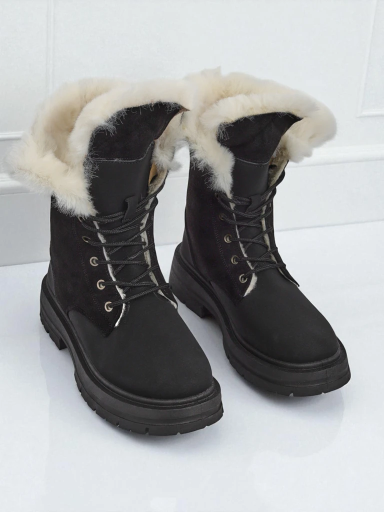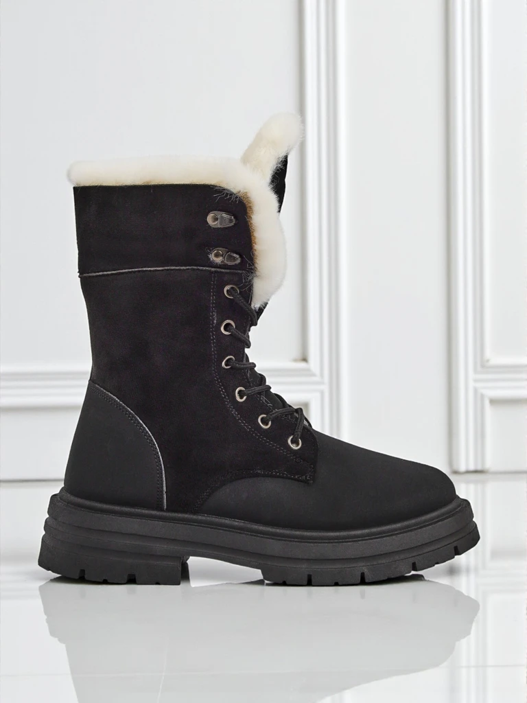 - Bottes de cheville pour femmes dans un style lacé, finies avec de la douce fourrure. Les matériaux utilisés sont du cuir écologique mat et du daim. L'intérieur des chaussures est isolé. Parfait pour l'hiver !