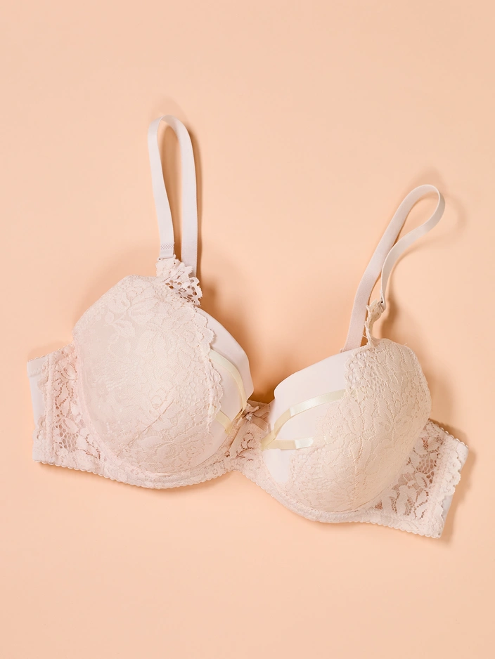 • Excellent soutien-gorge rembourré avec bonnets en dentelle. Le modèle se ferme à l'arrière et possède des bretelles amovibles et ajustables, ainsi qu'un nœud décoratif entre les bonnets. REMARQUE : Précision de mesure (+/-) 1 cm.